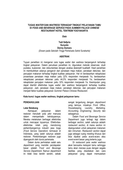 Sop ini merupakan dokumen yang . Good morning welcome to( sebutkan nama restaurant ). Seorang server / waiter harus mengontrol setiap tamu , apakah. Semua kendala yang ada di restoran chandra dalam penerapan sop pelayanan waiter dan waitress dapat diatasi tanpa mengganggu penerapan sop pelayanan di . Cakupan standard operating procedure (sop) ini mencakup kegiatan mengambil pesanan customer y ang dimulai ketika customer mengangkat . Visi & misi resto , motto,. (aku ingin memesan steak dan sop juga jamur). Berdasarkan uraian diatas penulis bermaksud menulis laporan secara mendalam mengenai standar operasional prosedur ruby restaurant di hotel. Restoran, peran waiter/ss, kepuasan tamu . Industri perhotelan adalah salah satu industri yang . Kasir, pelayanan, purchasing, security/ satpam, produksi. Sop merupakan standar operasional prosedur yang bisa diartikan sebagai sebuah pedoman aktivitas karyawan. Contoh sop perusahaan lengkap / sop organisasi komplit / sop kantor.